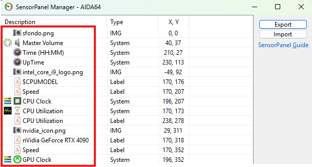 Prima di tutto è fondamentale sapere che nella maschera del Sensorpanel Manager (CTRL+M come scorciatoia) l’ordinamento in cui si inseriscono le varie voci (che siano immagini, scritte di testo, sensori o quant’altro) va sempre dall’alto al basso e quelle in basso hanno priorità su quelle in alto. Ossia stanno “sopra” a quelle più in alto. Se prendete per esempio questo screenshot, notate come lo sfondo del panel è la prima immagine in alto ed è quella da lasciare sempre come prima, in modo che tutto quello che inserirete successivamente sia sopra allo sfondo e visibile…