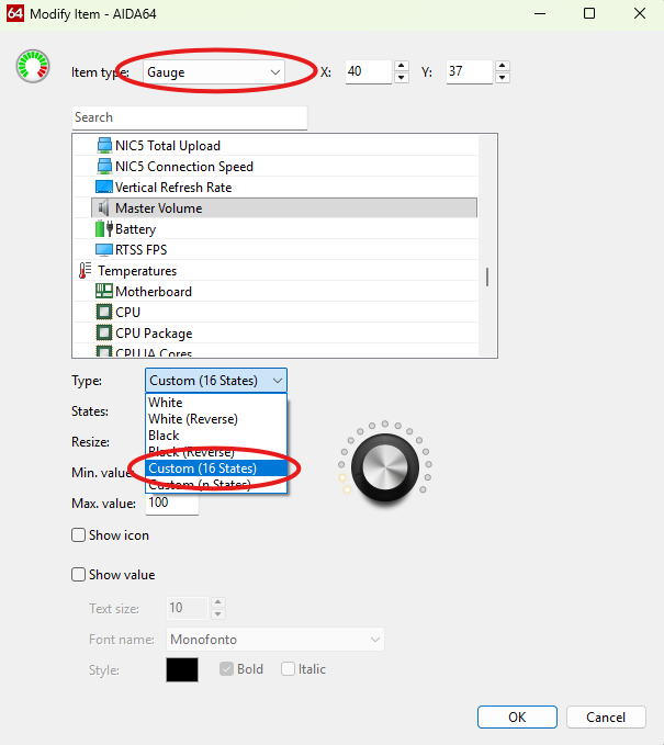 Le cosiddette “gauge” sono dei sensori particolari per i quali, in base al loro utilizzo e ad una scala di valori che potrete indicare dentro al loro setup, dovrete assegnare 16 immagini che possano mostrare una sorta di progressione dell’immagine stessa. I numeri vanno dallo 0 al 15 e permettono di indicare lo stato di utilizzo di un oggetto specifico. Nel mio caso, le ho usate per i sensori di temperatura e velocità della pompa dell’acqua e per il pomello del volume audio: